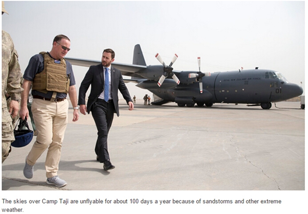 由于地面的炸弹袭击行为猖獗,目前联军只能乘坐飞机来出入军营。当然,伊斯兰国并不是这里的唯一威胁。总理一行还需要时刻提防蝎子、毒蛇以及患有狂犬病的猫狗等动物的威胁。